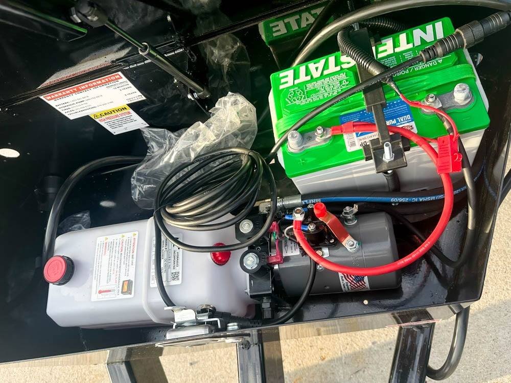 High-Capacity Hydraulic Dump System – Powered by a 12V DC hydraulic pump delivering 3,200 PSI lift power and dual 3″ x 30″ cylinders for strong, consistent dumping performance.
