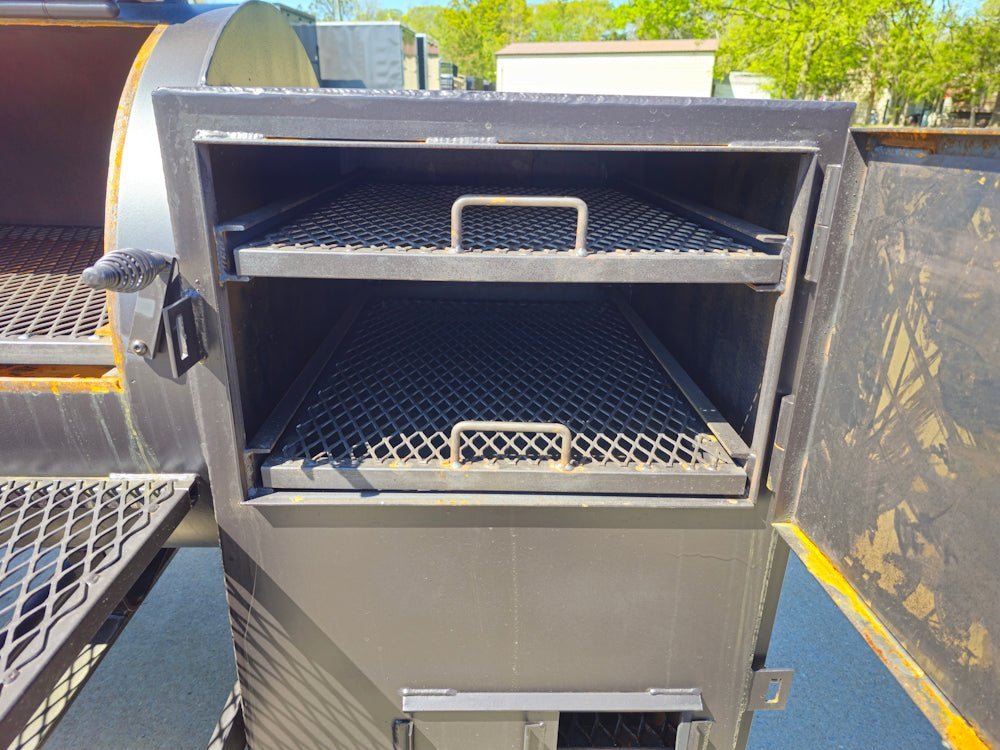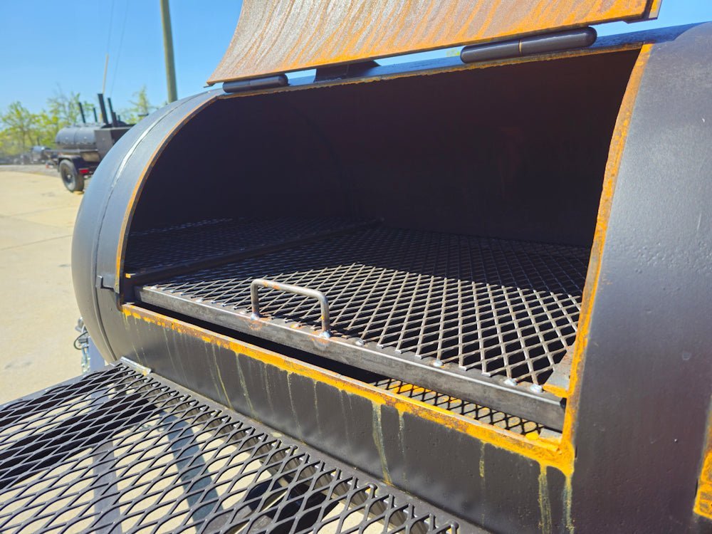 Two large barrel trays (32” L x 28” W) allow for cooking multiple meats or sides at once.